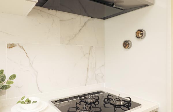 油汚れなどのお手入れが楽なホーロー製のキッチンパネルを採用。